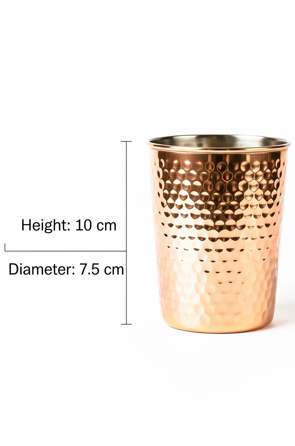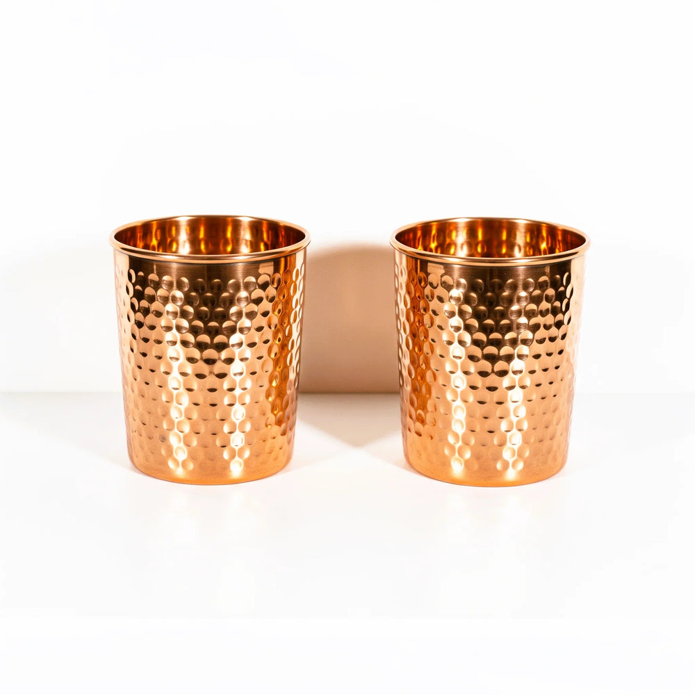 Includes 2 hammered copper bottles (950ml each) and 2 matching hammered copper glasses (300ml each).